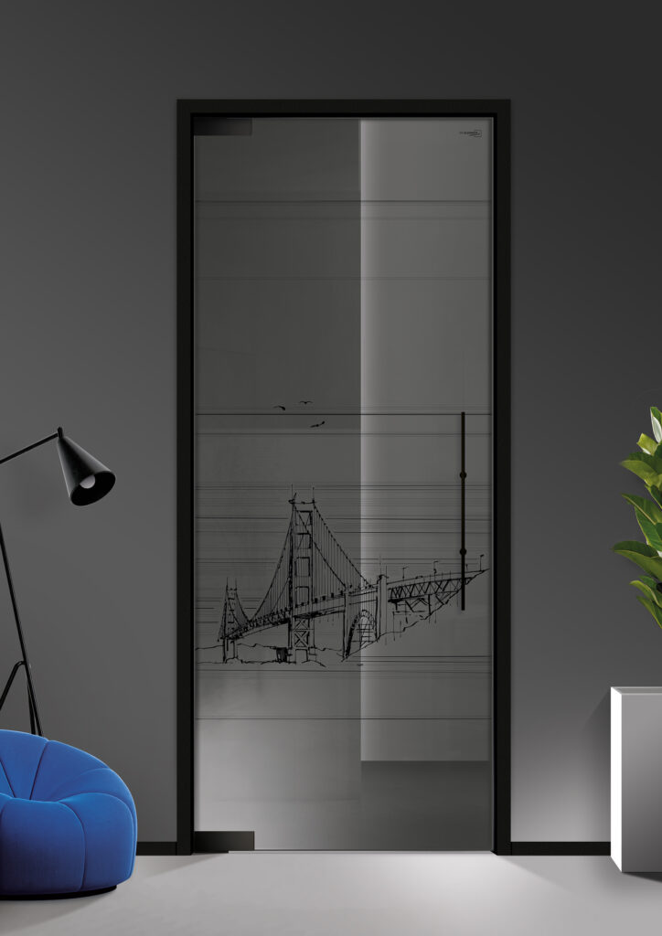 Eine weitere eindrucksvolle Kombination ist das Glasdesign Golden Bay, im sehr geschmackvoll nuancierten schwarzen Druck auf dem getönten Float Grau-Glas.