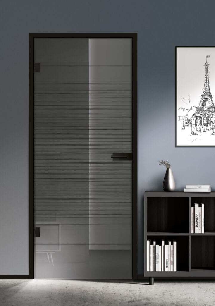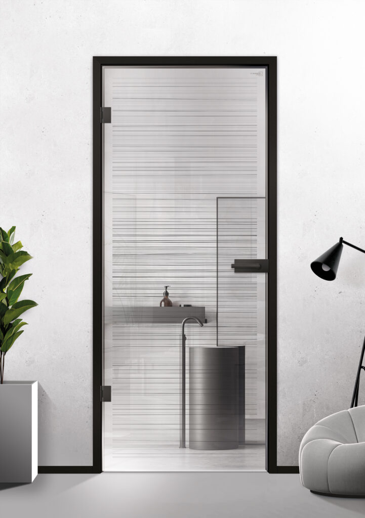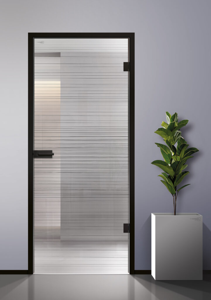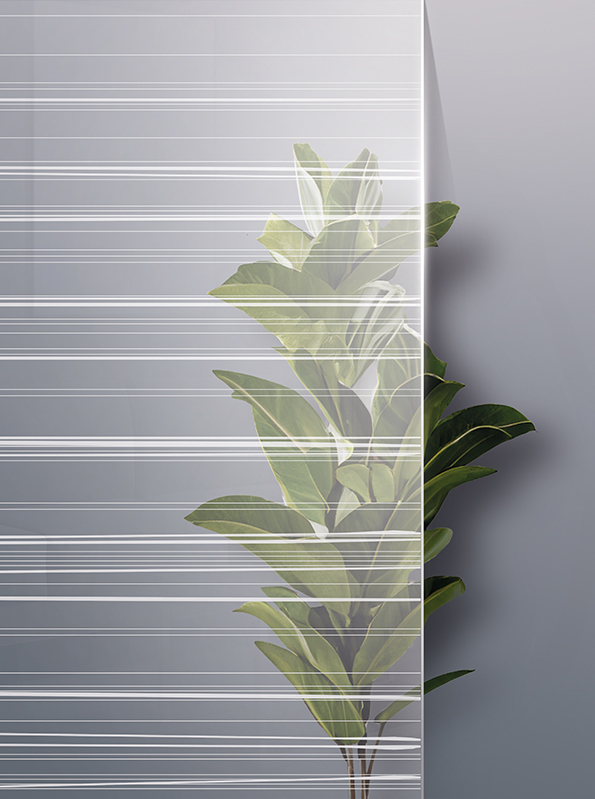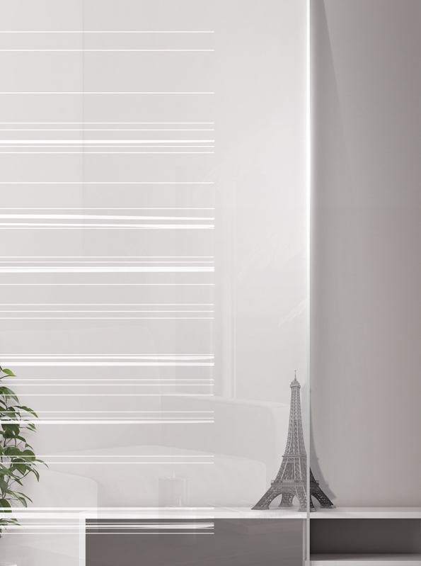 Diese Variante des Tecido Designs zeichnet sich, genauso wie das Hauptmotiv der Tecido Familie, durch die markanten und diagonal eingebrachten Linien aus. Insgesamt erstreckt sich das Design aber voller über die Glastür.
