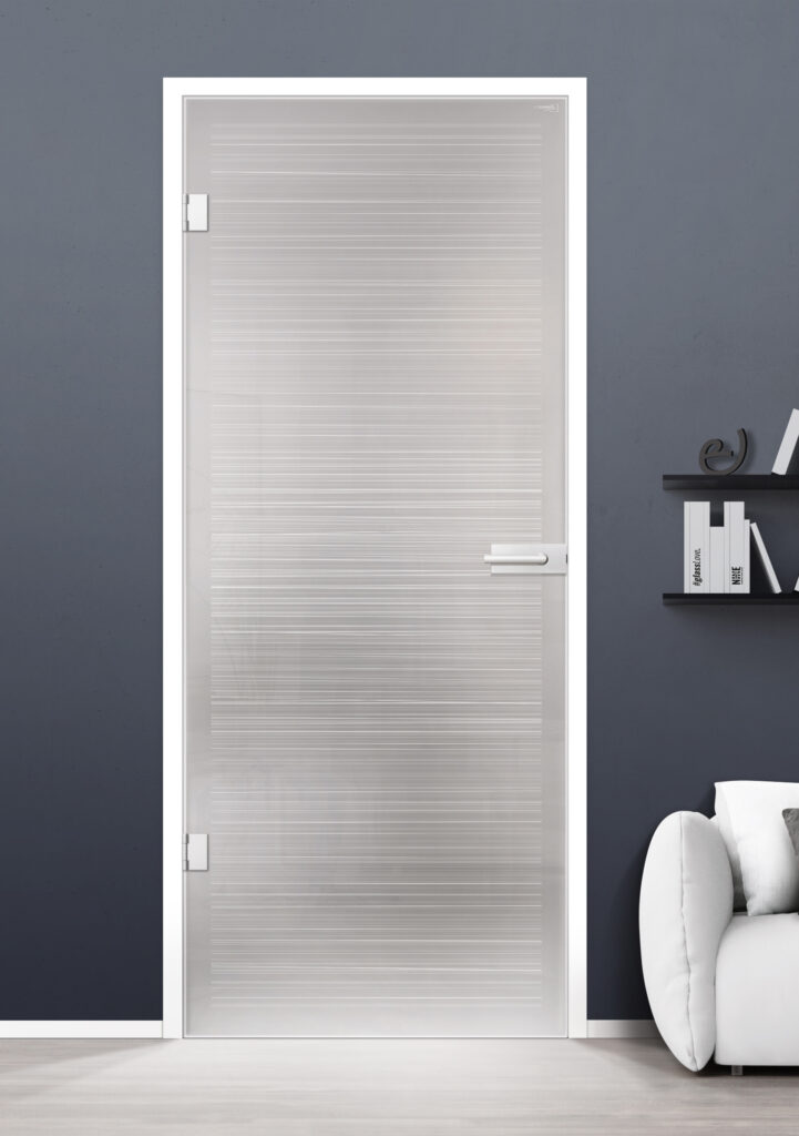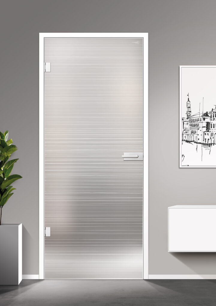 Die abgebildete Ausführung in weißem Digital-Druck auf SatinatoLH ist eine sehr edel wirkende Variante. Insbesondere durch die Kombination mit der weißen Zarge setzen Sie Ihre moderne Glastür harmonisch in Szene.