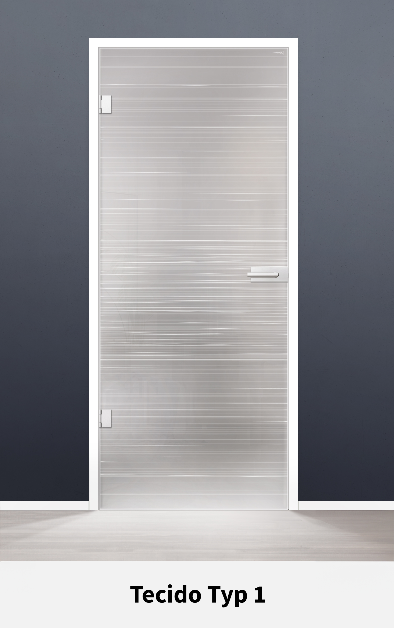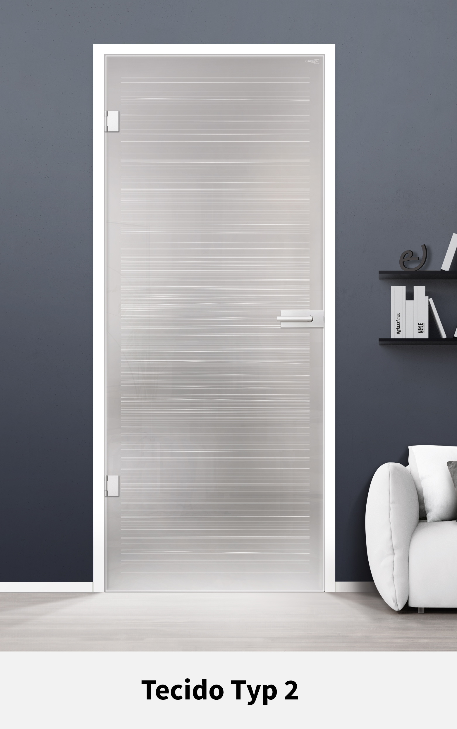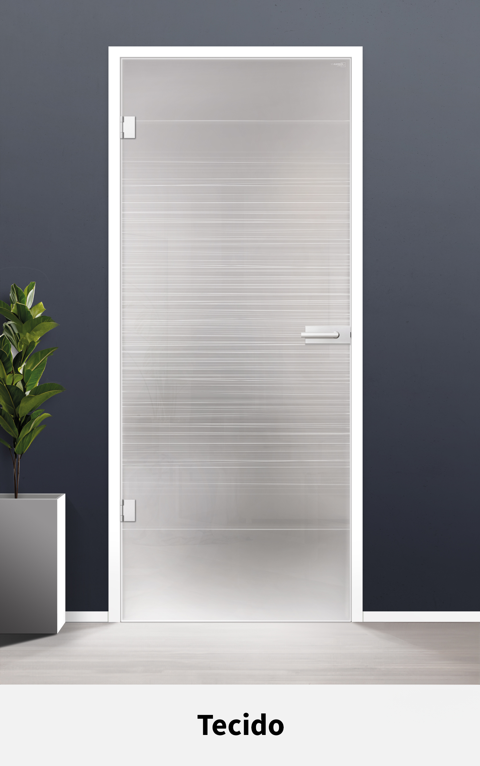 Diese Variante des Tecido Designs zeichnet sich, genauso wie das Hauptmotiv der Tecido Familie, durch die markanten und diagonal eingebrachten Linien aus. Insgesamt erstreckt sich das Design aber voller über die Glastür.
