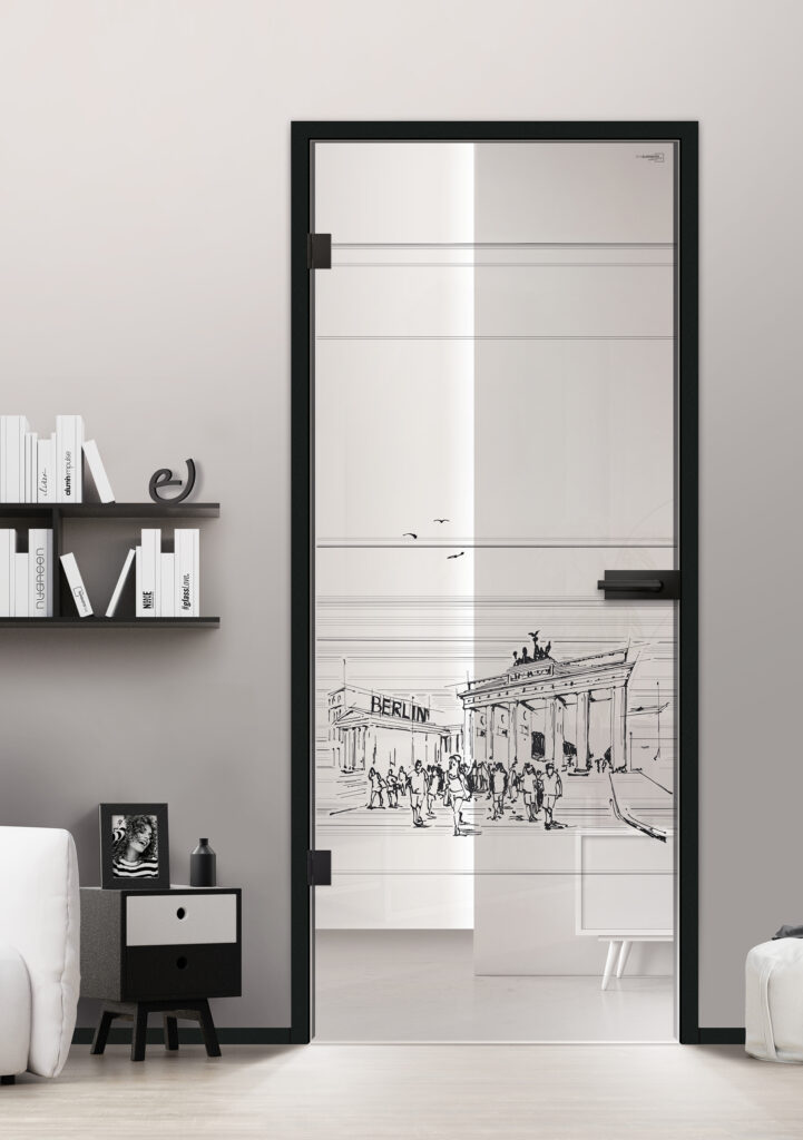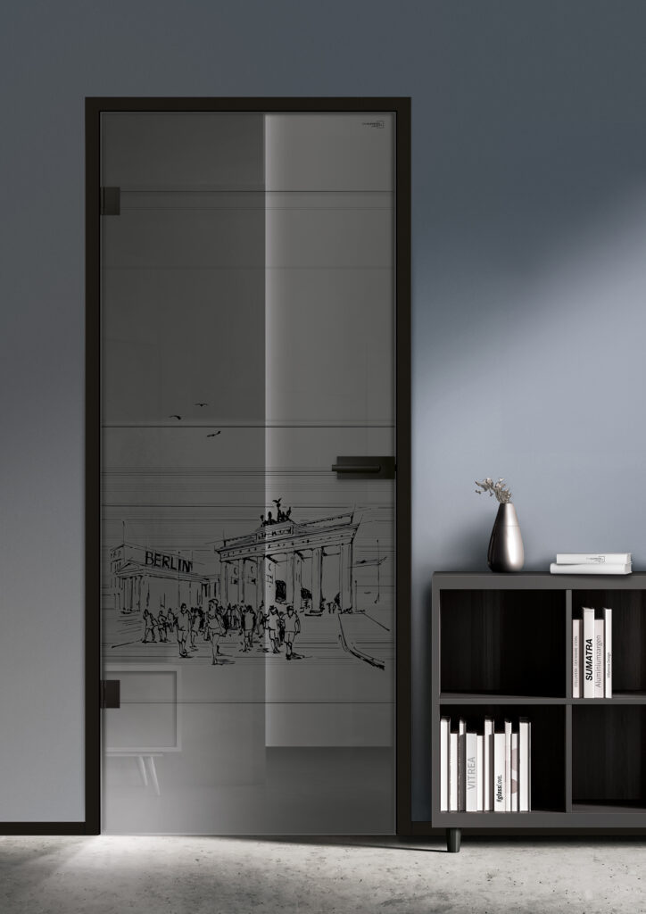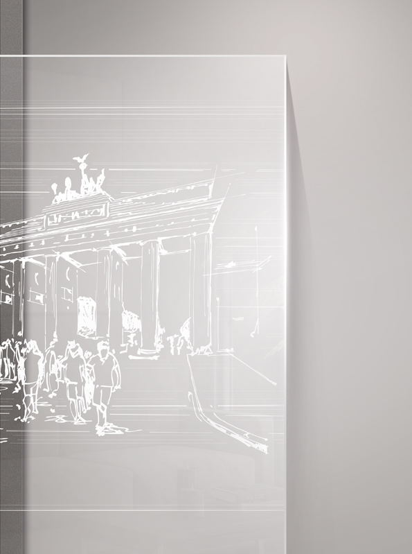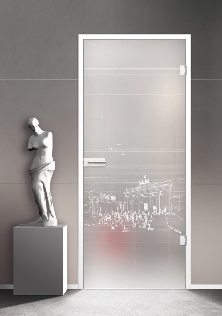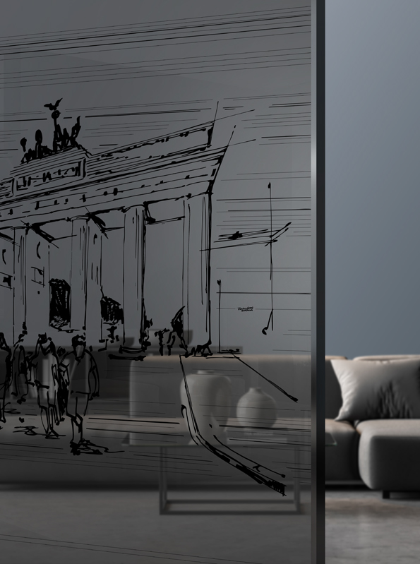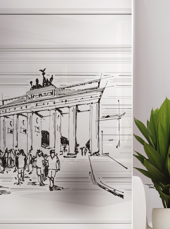 Das ikonische Wahrzeichen Berlins wird so auf ästhetische Weise, auf der Glastür in Szene gesetzt. Die Keramikfarben werden im Glas eingebrannt, wodurch das Design langlebig, kratzfest und UV-beständig ist.